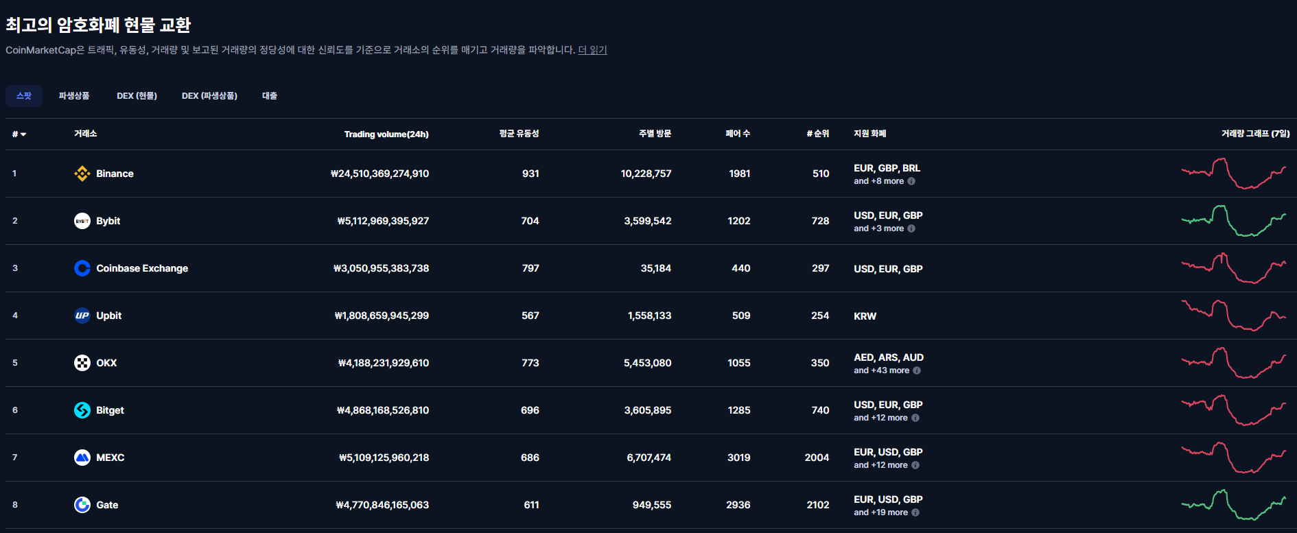 - 가격 변동률(24h/7d), 주요 거래소별 가격 차이도 제공
